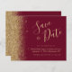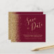 Cet élégant budget enregistrer la carte date comporte une bordure de fausse parties scintillant or le long du bord gauche. Le texte personnalisable combine des scripts d'écriture fantaisie de couleur or, des polices de cuivre et d'italique sur un arrière - plan rouge bordeaux. L'envers est assorti d'une parties scintillant bordeaux et dorée.