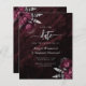 This elegant wedding save the date card features burgundy red floral bouquets set off with silver faux foil greenery in two corners, on a burgundy watercolor agate background. The customizable text combines silver gray serif, italic and handwriting fonts. The reverse side features a matching burgundy and silver floral design.