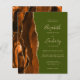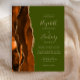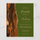 Le bord gauche de cette élégante faire-part de mariage moderne est orné d'une bordure d'aquarelle brune et d'orange brûlée, bordée d'une parties scintillant en faux or. Le texte personnalisable associe écriture brune, copperplate et polices italiques sur un arrière - plan vert olive. L'envers présente une conception d'agate correspondante.