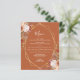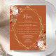 This elegant modern wedding menu features a gold geometric frame decorated with watercolor floral bouquets in autumn colors of burnt orange, peach, burgundy and blush on a burnt orange background. The customizable text combines white whimsical handwriting and copperplate fonts. The reverse side is solid burnt orange.
