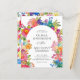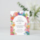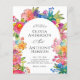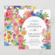 La conception de l'invitation de mariage est élégante et vibrante, avec une bordure florale aquarelle joyeuse qui ajoute de la chaleur et du charme tout en encadrant magnifiquement le texte. La typographie combine une police serif sophistiquée pour les noms avec un script délicat pour "Et", créant un intérêt visuel. L'alignement central du texte assure une apparence propre et formelle, rendant les détails faciles à lire. Les tons floraux pastel et vifs complètent le thème romantique, ajoutant une touche festive et animée.