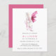 Une invitation à la fête d'anniversaire élégante et économique avec une aquarelle illustrant des chaussures pointes de ballet rose et une typographie simple rose et gris.