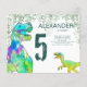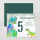 Ce T-Rex rugissant et ce vélociraptor colorés en vert invitent les fans de dinosaures à une fête d'anniversaire pour les amoureux des dinosaures. Personnalisez cette invitation d'anniversaire économique avec Tyrannosaurus et vélociraptor avec le nom du garçon ou de la fille qui fête son anniversaire, son âge et les détails de la fête et vous êtes prêt pour une fête d'anniversaire sur le thème de la jungle des dinosaures remplie de plaisir. Toutes les espèces de dinosaures sont les bienvenues. Illustrations de dinosaures de l'ère jurassique préhistorique, œuvre originale de l'artiste Catherine Sweetman.
