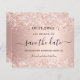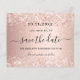 Une carte Save the Date pour une fête Sweet 16, 16e anniversaire. Un arrière - plan à l'aspect métallique doré rose décoré de poussière de parties scintillant imitation. Personnalisez et ajoutez une date et un nom/âge. Le texte : Save the Date est écrit avec un grand script de style à la main tendance avec des swashes.