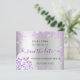 Une carte de Save the Date girly et tendance pour un Sweet 16, fête d'anniversaire de 16 ans. Un fond moderne d'aspect argenté décoré de poussière de paillettes faussement violette et d'une robe. Personnalisez et ajoutez une date et un nom/âge. Lettres noires et violettes. Le texte : Save the Date est écrit avec un grand style de lettrage manuscrit tendance.