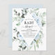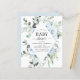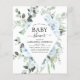 Budget Dusty Blue Floral Roses et Eucalyptus Botanical Greenery Aquarelle Printemps ou été Baby Shower Invitations - comprend belle et élégante typographie script avec des fleurs botaniques modernes et la verdure pour la spéciale Mère à être la célébration d'un bébé garçon ou bébé fille nouvelle arrivée.