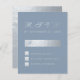Un élégant RSVP budget pour un mariage. avec des couleurs mariage de bleu et d'argent poussiéreux. L'arrière - plan est bleu poussiéreux. Le titre RSVP est un faux papier argenté, le reste du texte est gris argenté, sauf la lettre M, qui est bleu poussiéreux. Le titre RSVP et la lettre M sont écrits dans un élégant script calligraphique, le reste en casquette. La boîte rectangulaire pour le nom, les petites boîtes de carré et le dos sont faux feuille d'argent.