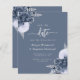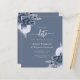 This elegant wedding save the date card features dusty blue floral bouquets set off with silver faux foil greenery in two corners, on a dusty blue background. The customizable text combines silver gray serif, italic and handwriting fonts. The reverse side features a matching dusty blue and silver floral design.
