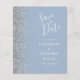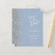 Le bord gauche de cet élégant mariage moderne, à l'exception de la carte de date, comporte une bordure en faux parties scintillant argent. Le texte personnalisable combine écriture manuscrite blanche et polices de cuivre sur un arrière - plan bleu poussiéreux. L'envers présente un design bleu et argent poussiéreux assorti.