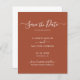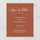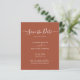 Budget élégant script minimaliste moderne non photo brûlé orange terre terre cuite rouille boho desert mariage enregistrer la date faire-part personnalisé abordable petit budget flyer. Un modèle simple design propre dispose d'un élégant écriture manuscrite cursive script de typographie "Save the Date" texte. Cette carte classique est parfaite pour un couple qui veut une traditionnelle enregistrer la date avec une touche moderne, sans photo. Si vous avez besoin d'aide ou d'articles correspondants, veuillez contacter le concepteur.