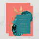 This elegant wedding invitation features a lush, romantic floral bouquet in teal blue with gold faux foil and glitter foliage on a coral background. Customize the gold-colored text in stylish fonts on a teal rectangle. The reverse side is solid coral.