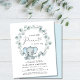 Un petit garçon mignon et abordable saupoudrera l'invitation avec "A Sweet Little Peanut Is On His Way" écrit dans la typographie moderne et un script élégant avec un coeur gonflé, et une aquarelle d'un petit éléphant bleu pastel dans une couronne de verdure d'eucalyptus.