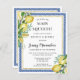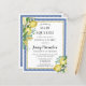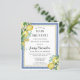 Un thème de fête prénuptiale au citron "A She Found Her Main Squeeze" est le brunch nuptial et le champagne d'été parfaits. Les fruits d'agrumes rafraîchissants et frais créent toujours de beaux décors et rafraîchissements. La collection Jenny's Lemons associe des citrons aquarelles chics à des carreaux de faïence bleus méditerranéens. Dans ce design, les carreaux créent un cadre bleu. Un mince cadre doré l'embellit. Deux bouquets de citrons ajoutent une touche florale. "She found her Main Squeeze" est écrit en haut. Le reste des détails de la fête prénuptiale suivent.