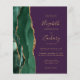 Le bord gauche de cette élégante faire-part de mariage moderne est orné d'une bordure en aquarelle vert émeraude, recouverte d'une parties scintillant en faux or. Le texte personnalisable combine écriture manuscrite couleur or, cuivre et polices italiques sur un arrière - plan violet. L'envers est assorti d'une agate vert émeraude et or.