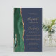 Le bord gauche de cette élégante faire-part de mariage moderne est orné d'une bordure en aquarelle vert émeraude, recouverte d'une parties scintillant en faux or. Le texte personnalisable combine écriture manuscrite couleur or, cuivre et polices italiques sur un arrière - plan bleu marine. L'envers est assorti d'une agate vert émeraude et or.