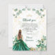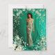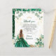 L'invitation de la quinceañera présente un design luxueux d'inspiration nature avec une palette de couleurs vert et or. L'avant montre une aquarelle d'une jeune femme dans une robe de ballon émeraude encadrée de feuilles d'eucalyptus, de fleurs et d'or, créant un look élégant et rêveur. Le dos poursuit le thème avec une photo glamour d'une jeune femme dans une robe pétillante sur un fond vert riche, entouré par les mêmes éléments floraux et botaniques pour une sensation cohésive et sophistiquée.