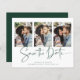 BUDGET Moderne manuscrit Enregistrer la date Carte photo multiple en vert émeraude et blanc dans une police qui est élégant et évoque une sensation manuscrite romantique. Conçu pour utiliser trois de vos photos préférées pour une personnalisation supplémentaire. Ajoutez facilement vos noms et dates pour un design vraiment personnalisé. **Notre document BUDGET est plus petit et plus délicat, mais toujours beau!** Si vous avez besoin d'aide ou de correspondances, veuillez nous contacter à cedarandstring@gmail.com.