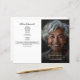 Les programmes de funérailles photo personnalisés avec nécrologie et ordre de service offrent une façon digne et personnalisée d’honorer la vie d’un être cher. Doté d'une photo mémoriale pleine page avec des polices de caractères serif et des scripts élégants, ce modèle comprend un espace pour les remerciements, les porteurs de palettes, les porteurs de fleurs et un message d'hommage sincère. L'agencement intérieur coordonné fournit un ordre structuré de service parallèlement à l'espace pour une nécrologie écrite ou un résumé de la vie, ce qui en fait l'endroit idéal pour les mémoriaux, les cérémonies de retour ou les célébrations de la vie. Ce programme funéraire personnalisable allie simplicité et élégance pour créer un souvenir significatif pour la famille et les invités.