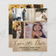 Élégant enregistrer notre date faire-part. Ce modèle en or rose dispose d'espace pour 4 de vos photos de couple préférées en blanc avec calligraphie manuscrite cool en gris foncé. Facile à éditer avec vos propres détails uniques.