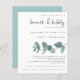 Budget Eucalyptus Brunch Bubbly Bridal Shower Invitation. Un prix économique PETIT 4,5 po x 5,6 po alternatif. Disponible dans un STOCK SEMI-GLOSS 110 lb CARD qui est l'option par défaut (plus épais pour les invitations), OU un STOCK SATIN FINISH 80 lb THINNER PAPER (idéal pour les boîtiers). Les enveloppes sont en option et légèrement plus grandes que la taille de la carte. Style minimaliste moderne avec une seule branche de feuilles d'eucalyptus bleus turquoises de l'autre côté de la page du côté gauche. Le Brunch & Bubbly est aménagé dans un style d'écriture moderne et est placé au-dessus des feuilles avec vos noms, avec les autres détails en dessous. Personnalisez facilement les détails à votre façon. Un arrière - plan bleu turquoise coordonné est à l'envers. Vous pouvez modifier les couleurs de texte et d'arrière - plan à n'importe quel de vos choix pour correspondre à votre thème de couleur mariage.