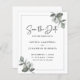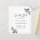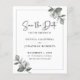 Budget Minimaliste Calligraphie Dusty Green Eucalyptus Mariage Enregistrer la date... Notre carte botanique abordable Save the Date dispose d'un cadre de texte vert avec des branches d'eucalyptus vert poussiéreuses en vogue créant une bordure élégante pour le texte de l'invitation à l'intérieur. Le dos de la carte contient les informations de votre site Web mariage et un modèle graphique de code QR que vous pouvez remplacer par votre propre (ou supprimer). Tous les exemples de texte des deux côtés de la carte (à l'exception du graphique de texte Enregistrer la date) peuvent être facilement révisés avec vos propres détails sur le modèle de personnalisation.