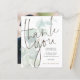 Un prix économique PETIT 4,5 po x 5,6 po alternatif. Disponible dans un STOCK SEMI-GLOSS 110 lb CARD qui est l'option par défaut (plus épais pour les invitations), OU un STOCK SATIN FINISH 80 lb THINNER PAPER (idéal pour les boîtiers). Les enveloppes sont en option et légèrement plus grandes que la taille de la carte. Un design botanique élégant avec un arrière - plan teinté d'eucalyptus feuilles bordant du côté gauche et mettre une typographie stylisée pour le mot Merci remplissant la meilleure partie de la page. Sur le dos, remplacez l'exemple de photo par votre préféré de la journée comme souvenir pour vos invités. Personnalisez facilement le reste du texte.