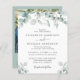 Faire-part de mariage tout-en-un élégant et économique avec aquarelles vert sauge vert eucalyptus verdure, script élégant et typographie gris doux. Au contraire, ajoutez votre photo et entrez l'adresse de votre site Web mariage pour créer un code QR que vos invités pourront scanner en ligne vers RSVP et obtenir des détails supplémentaires sur le mariage, tels que les itinéraires et les hébergements.