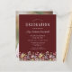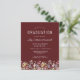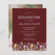 Une belle bordure florale d'aquarelle de fleurs sauvages décore le bord inférieur de cette invitation branchée de fête de graduation boho. Customisez le texte blanc sur un arrière - plan rouge bordeaux avec le nom du diplômé en écriture manuscrite ; l'année scolaire et scolaire en sans serif ; et la date, le lieu et les détails RSVP en police serif. Remplacez facilement l'image de l'échantillon au dos par une photo verticale de votre diplômé.