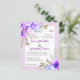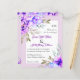 FAIRE-PART DE MARIAGE lilas floral violet BUDGET avec code QR pour RSVP. Il affiche des bouquets de fleurs dans les tons violets et bleus aux coins tandis que votre texte est placé dans un cadre blanc avec une bordure lilas. L'arrière comprend des guirlandes fleuries sur les parties supérieure et inférieure et le code QR pour RSVP.