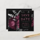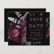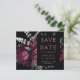 Ce mariage élégant et maussade Save the Date propose un bouquet floral luxuriant et romantique en rouge bordeaux avec fausse feuille argent et feuillage parties scintillant sur un arrière - plan noir. Customisez le texte gris argenté et bordeaux pâle dans des polices de caractères élégantes sur un rectangle noir, et ajoutez l'URL de votre site Web mariage au dos noir solide.