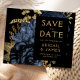 Ce mariage élégant et maussade Save the Date propose un bouquet floral luxuriant et romantique en bleu marine avec fausse feuille d'or et feuillage de parties scintillant sur un arrière - plan noir. Customisez le texte de couleur or dans des polices de style sur un rectangle noir, puis ajoutez l'URL de votre site Web mariage au dos noir solide.