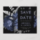 Ce mariage élégant et maussade Save the Date card présente un bouquet floral luxuriant et romantique en bleu marine avec fausse feuille argent et feuillage de parties scintillant sur un arrière - plan noir. Customisez le texte gris argenté et bleu poussiéreux dans des polices de caractères élégantes sur un rectangle noir, et ajoutez l'URL de votre site Web mariage au dos noir solide.