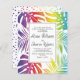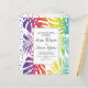 BUDGET Rainbow tropical monstera et palm feuille gay et lesbienne faire-part de mariage avec code QR pour RSVP en ligne. Il présente un motif de feuilles tropicaux aux couleurs de l'arc-en-ciel avec contour doré et votre texte dans un cadre blanc. Le dos comprend un motif coloré de confettis et le code QR. Analysez-le sur RSVP en ligne.