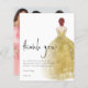 Budget Gold Gown Photo Auburn Haired Girl Quinceañera Merci. Un prix économique PETIT 4,5 po x 5,6 po alternatif. Disponible dans un STOCK CARTE SEMI GLOSS 110 lb qui est l'option par défaut (recommandé pour les invitations), OU un STOCK PAPIER THINNER SATIN FINISH 80 lb (idéal pour les boîtiers). Style élégant pour votre 15ème anniversaire de fête merci avec le rétroviseur d'une fille avec des cheveux roux auburn dans une belle robe dorée brillante à droite, et Merci dans un ensemble de style manuscrit. Personnalisez facilement le reste du texte à vos propres détails. Remplacez l'exemple de photo au dos par un favori de votre fête.