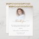 Un rapport qualité-prix BUDGET alternative sur une taille plus petite 4,5 x 5,6" semi-brillant poids 110lbs, qui est d'une épaisseur similaire à une carte postale (cependant ne convient pas à l'utilisation comme carte postale.) VEUILLEZ NOTER qu'il y a UN par feuille. Parties scintillant d'or de la photo de Graduation budgétaire Merci. Les bordures en faux parties scintillant de verre sont au sommet des deux côtés. Le Merci est dans un script élégant avec des swashes. Personnalisez facilement le texte selon vos besoins et remplacez l'exemple d'image par le vôtre. Pour conserver l'aspect contemporain minimaliste de ce design, une photo avec un arrière - plan de couleur claire fonctionnera bien.