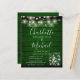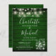 Un élégant faire-part de mariage à budget rustique avec de jolies lampes à cordes, des jarres de maçon, des noms de style signature et une typographie chic sur un arrière - plan en bois rustique vert émeraude. Conçu par Thisisnotme©