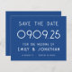 Une alternative de 4,5 x 5,6 pouces à prix réduit de 110 livres d'épaisseur similaire à une carte postale. Il y a UN par feuille. Budget Grosse typographie Mid Blue Wedding Enregistrer la Date, l'élégance moderne avec ce design de typographie stylisé entièrement personnalisable. Personnalisez facilement le texte et, si vous avez un site Web mariage, générez automatiquement un code QR pour lui au verso en remplaçant l'exemple d'URL à celui de votre site Web mariage. Vous pouvez supprimer l'exemple de code QR si cela n'est pas nécessaire via l'option Modifier plus, où vous pouvez également modifier des couleurs et des styles de texte et des couleurs arrière - plans de chaque côté si vous le souhaitez.