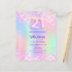 Une invitation à la fête du 21e anniversaire féminine et féminine. Devant : Un arc-en-ciel, arrière - plan de couleur holographique en violet, rose, vert menthe. Décoré de confettis rose vif. Personnalisez et ajoutez un nom et des détails du parti. Le nom est écrit avec un script de style écrit à la main, des lettres de couleur violette. 1 feuille = 1 invite imprimé bord à bord.
