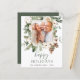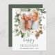 Budget Rustic Winter Happy Holidays Carte photo de Noël avec Fleurs Florales Blanches et Verdure, Branches de Pins, Eucalyptus, Pinecones avec un Arrière - plan simple.