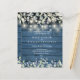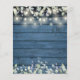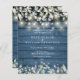 Un faire-part de mariage à budget rustique avec de jolies lampes à cordes et des feuilles sauge et lilas qui tombent sur un arrière - plan de panneaux de bois rustique bleu et vos détails mariages ensemble dans un texte classique élégant. Conçu par Thisisnotme©