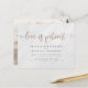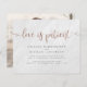 Oui ! Des circonstances imprévues sont difficiles à prévoir, mais avec ces cartes de report mariages, vous pouvez facilement faire savoir à vos proches! Avec un arrière - plan en marbre blanc. Les mots "l'amour est patient" apparaissent en haut dans une calligraphie à feuille d'or rose avec des tourbillons doux. Dans le cadre de la sélection du budget ici sur Zazzle, ces invitations ne sont pas fournies avec des enveloppes et ne s'insèrent pas dans une enveloppe de taille standard. La taille la plus proche est A6 mais il y aura un écart d'environ un demi-pouce. Si vous n'avez pas peur du manque de douceur, vous pourriez utiliser des enveloppes A6 aussi largement disponibles. Sinon, cette conception peut être transférée dans un format standard 5x7 (avec enveloppes) à l'aide de l'outil de transfert de conception. À titre d'exemple, au moment de la rédaction du présent document, 100 invitations budgétaires (y compris une remise sur le volume) coûteraient environ 39 $, alors que 100 invitations standards 5x7, y compris des enveloppes, coûteraient environ 135 $. Votre kilométrage peut varier en fonction des codes promo disponibles de Zazzle, des ventes à l'échelle du site ou des changements de prix.