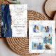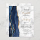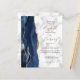Le bord gauche de cette élégante invitation de mariage moderne présente une bordure d'agate aquarelle bleu nuit rehaussée de paillettes dorées fausses. Le texte personnalisable combine une écriture manuscrite dorée avec des polices copperplate et italique noires sur un fond en marbre gris et blanc. Le verso offre des espaces pour 4 photos (1 carré, 2 horizontales, 1 verticale longue) et de la place pour l'URL de votre site web de mariage ou d'autres informations.
