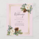De belles Roses blanches, des feuilles d'Eucalyptus, des cônes de pin rustique, et un cadre doré sur cet objet de mariage d'hiver qui fait partie d'une collection plus grande qui comprend des invitations à des mariages à budget, enregistrer les dates, RSVPs, étiquettes, cadeaux, papeterie, et plus encore. Pour une planification de mariage d'hiver GRATUITE, consultez le guide weddingdesignchic.com.