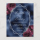 Cette élégante faire-part de mariage moderne présente un cadre géométrique argenté décoré de bouquets floraux bordeaux et argentés sur un arrière - plan bleu marine en faux feuille. Le texte personnalisable combine écriture fantaisie gris argenté, cuivre et polices italiques.