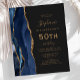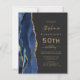 Le bord gauche de cette élégante invitation moderne à la fête du 50e anniversaire comporte une bordure en aquarelle bleu marine ornée d'une fausse parties scintillant dorée. Le texte personnalisable combine écriture manuscrite dorée, cuivre et polices italiques sur un arrière - plan noir ardoise. L'envers est assorti d'un design d'agate bleu marine et or.