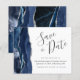 Cet élégant budget enregistrer la carte date dispose d'une bordure marine couleur aquarelle bordé d'une parties scintillant en faux argent. Le texte personnalisable combine le script d'écriture manuscrite gris charbon, les polices cuivre et italique sur un arrière - plan blanc. L'envers est assorti d'un design d'agate bleu marine et argent.