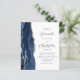 Le bord gauche de cette élégante faire-part de mariage moderne est orné d'une bordure en aquarelle bleu marine ornée d'une parties scintillant en faux argent. Le texte personnalisable combine le script gris charbon et les polices sans serif sur un arrière - plan blanc. L'envers offre de l'espace pour les détails mariages sur un arrière - plan blanc solide, ainsi qu'un code QR que les clients peuvent scanner pour visiter votre site Web et RSVP, ce qui permet d'économiser le coût d'impression et d'envoi de cartes RSVP séparées.