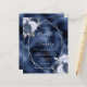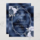 Cette élégante faire-part de mariage moderne présente un cadre géométrique argenté décoré de bouquets floraux bleu marine, bleu marine et argent sur un arrière - plan bleu marine imitation feuille. Le texte personnalisable combine écriture fantaisie gris argenté, cuivre et polices italiques. Ajoutez des détails supplémentaires au verso, ainsi qu'un code QR pour aider vos invités à visiter votre site Web mariage.