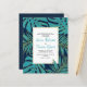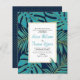 BUDGET turquoise, bleu marine et or monstère tropicale et palmier feuilles faire-part de mariage avec code QR à RSVP en ligne. Il présente un motif de feuilles tropicaux en bleu turquoise avec contour or sur bleu marine et votre texte dans un cadre blanc. L'arrière comprend un motif à points de polka d'or sur arrière - plan de marine et le code QR.