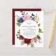 Une belle invitation à la douche nuptiale rustique avec texte dans un cercle blanc entouré d'un bouquet floral aquarelle aux tons marsala ou bordeaux, bleu marine, et rose. L'envers est une teinte de marsala assortie.